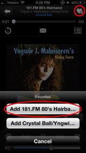 At this point it is important to make the station a favorite, so each time you want to listen, you dont have to go through the whole searching routine. To make it a Favorite, press the “Heart” in the top right corner, and then press “Add 181fm 80’s Hairbands to Favorites”.